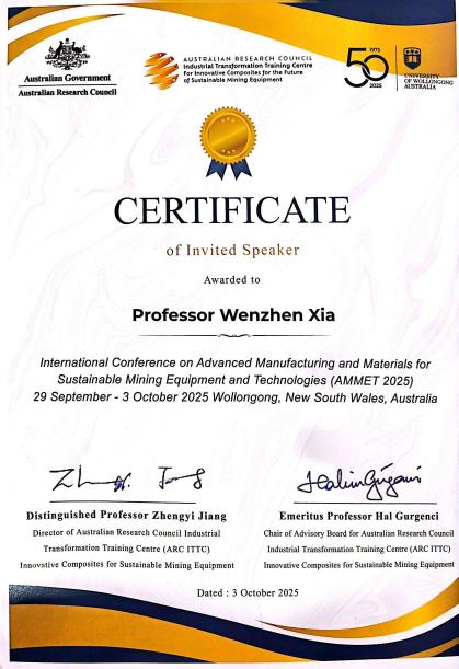 近日,我中心夏文真教授应邀赴澳大利亚伍伦贡,参加“2025年可持续采矿设备与技术的先进制造与材料国际会议(AMMET 2025)”。本次大会由澳大利亚研究委员会工业转型培训中心——“面向可持续采矿设备未来的创新复合材料中心”主办,汇聚了来自全球百余位专家学者,围绕先进材料制造、人工智能在矿业中的应用、绿色采矿技术等前沿主题展开了深入研讨与交流。