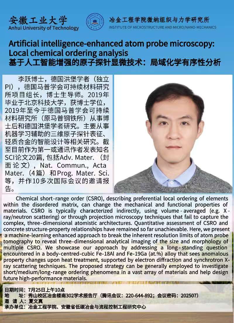 活动预告:德国洪堡学者李悦博士做题为《基于人工智能增强的原子探针显微技术:局域化学有序性分析》的报告